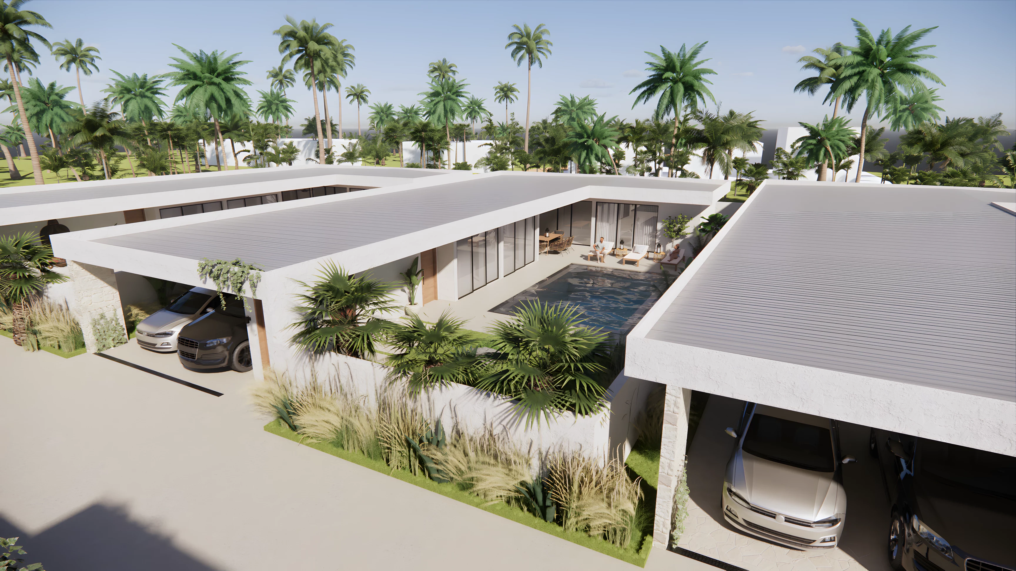 Každá rezidence má vlastní vchod a vyhrazená parkovací místa, což zajišťuje pohodlí, bezpečnost a soukromí. Prostor je navržen tak, aby byl elegantní a harmonický. K vilám vede nová příjezdová cesta, vstup je pak lemován dekorativní zelení, navržený v minimalistickém stylu. Cena vily je včetně vysokého standardu (podlahy, sanita, dlažba, A/C..).